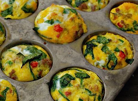 Make a batch of these Egg Muffins to last all week: mix your favorite vegetables such as mushrooms, peppers, or broccoli, add seasoning and mix with 10-12 eggs. Fill up a 12-muffin pan and sprinkle with cheese. Bake at 425 degrees for 20 minutes.