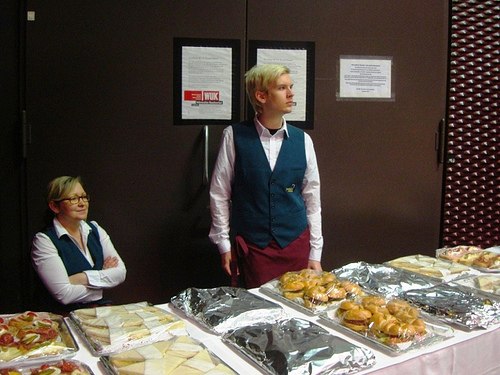 The meeting ended at noon and when we walked out fifteen minutes later he noticed a big buffet set up on the other side of the atrium. There were plenty of people standing around in white coats and black slacks but no one in line or sitting at tables.