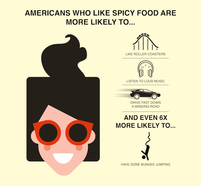 They were also six times more likely to have gone bungee jumping than those who don’t like any spice at all—and 45% more likely to have traveled out of the country.