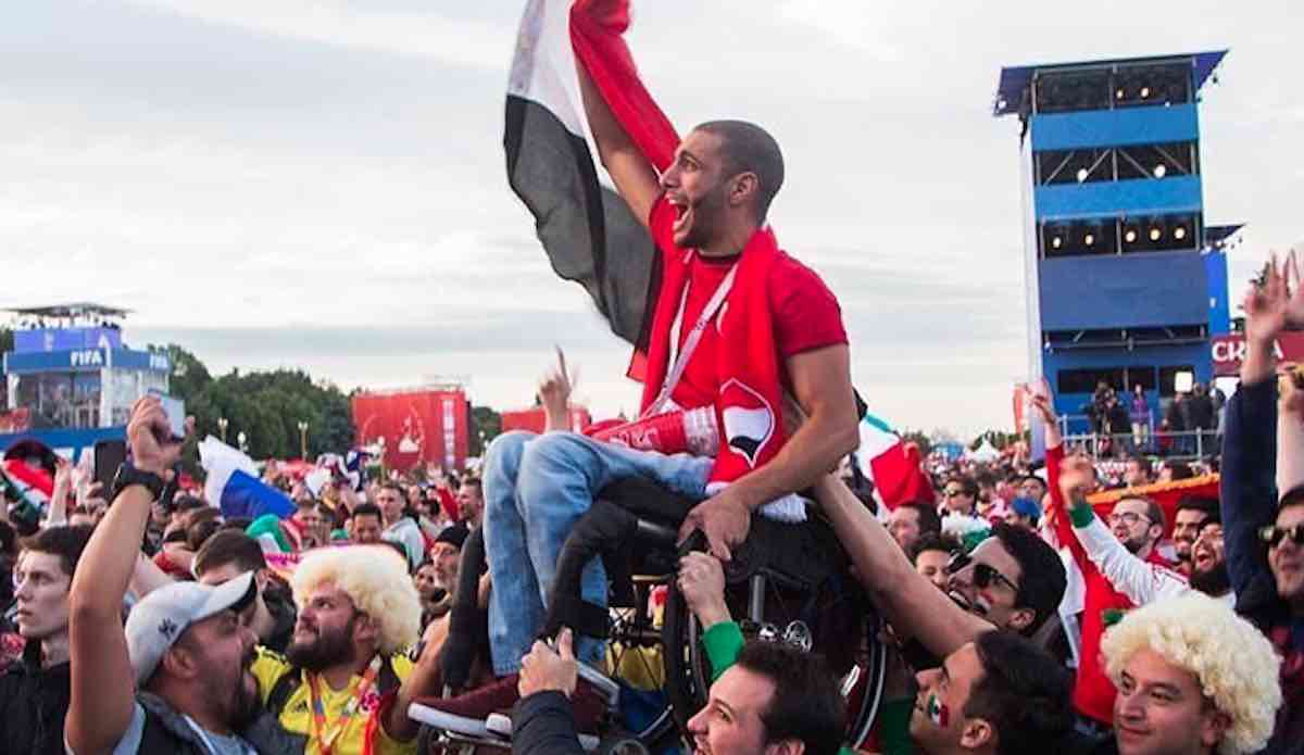 Colombia & Mexico fans lift up an Egyptian fan in a wheelchair in the fanzone so he can watch his country play.