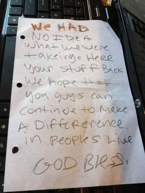“We had no idea what we were takeing. Here your stuff back. We hope that you guys can continue to make a difference in peoples lives. God Bless.”