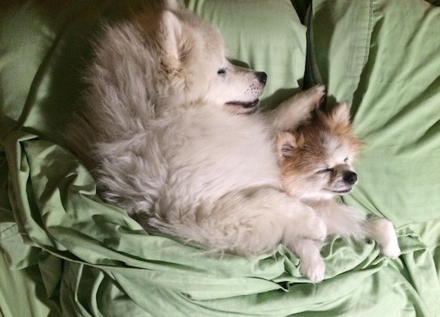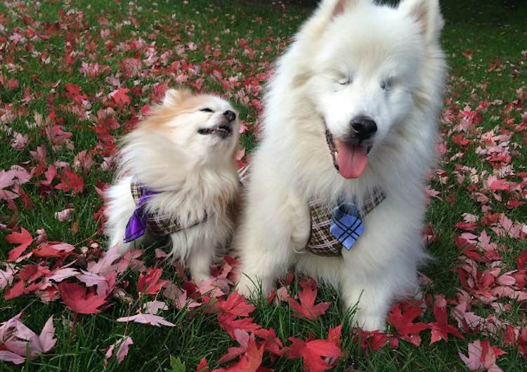 Zen, a recent Pomeranian rescue, rose to the occasion of guiding his blind friend by using a short leash running between them to safely lead him along.