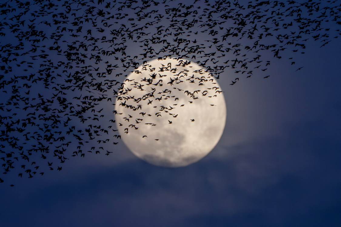 These stunning photos show the moment a huge murmuration of starlings flew in unison across March’s full moon.