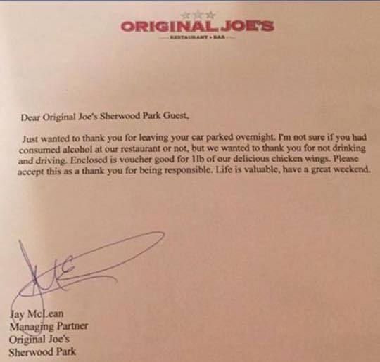 “Just wanted to thank you for leaving your car parked overnight,” the note read. “Not sure if you had consumed alcohol at our restaurant or not, but we wanted to thank you for not drinking and driving. Enclosed is a voucher for one pound of our delicious chicken wings. Please accept this as a thank you for being responsible. Life is valuable, have a great weekend.”