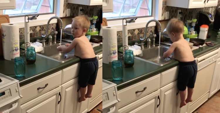 The toddler can be seen balancing by his belly on the edge of the family’s kitchen sink while he carefully washes his dishes.