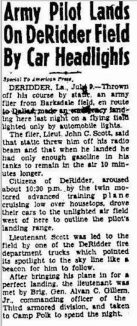 1941: Residents helped a plane in the dark after it was thrown off course from Barksdale, a military location in Shreveport. Residents drove their cars to the unlit air field to outline the pilot’s landing range. Lt. Scott was led to the field by a DeRidder firetruck pointing it’s spotlight to the skyline as a beacon for him to follow.