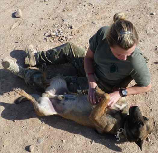 A female soldier who befriended a heroic bomb-hunting dog in Afghanistan tracked down her comrade and gave him a new home after he became too timid to serve on the front lines.