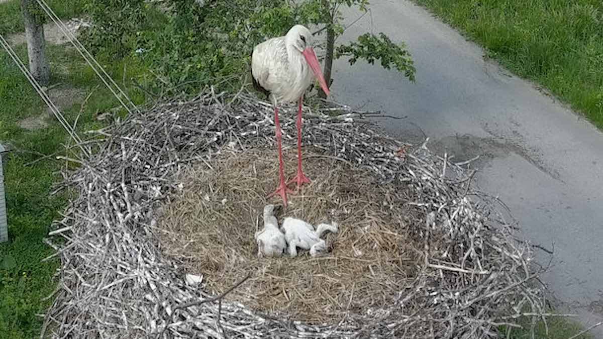 However, these new images captured in the town of Moshchun, 10 miles from Kyiv, show the return of storks is underway—at least for this couple that set up a home.