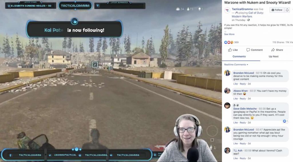 Game streaming is a social format in which content creators like TacticalGramma broadcast live video of the game they are playing. Public forums like Facebook are platforms that allow virtual strangers to tune in—and join in.