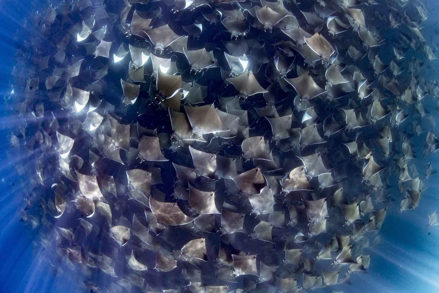 These jaw-dropping images show a sea filled with thousands of mobula ray fish appearing like large winged birds.