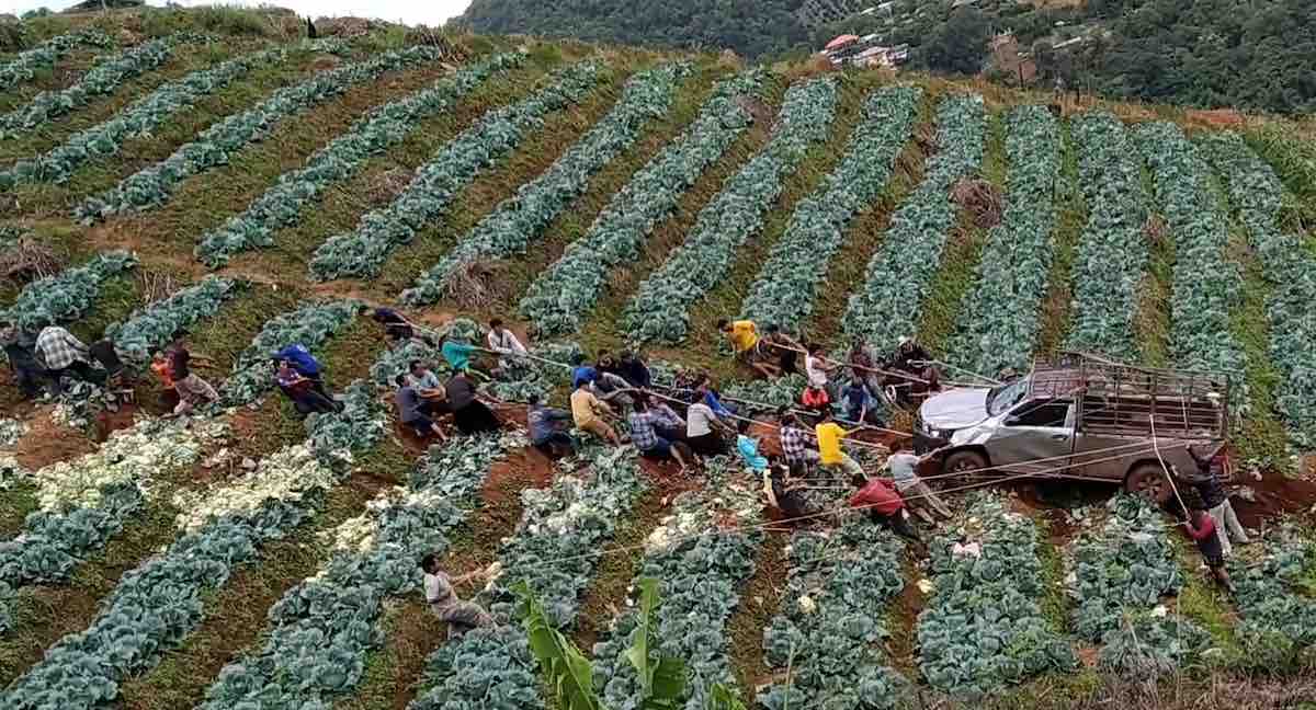 More than fifty locals volunteered to pull the old vehicle that rolled over the hills and was stuck on the edge of a cabbage field terrace.