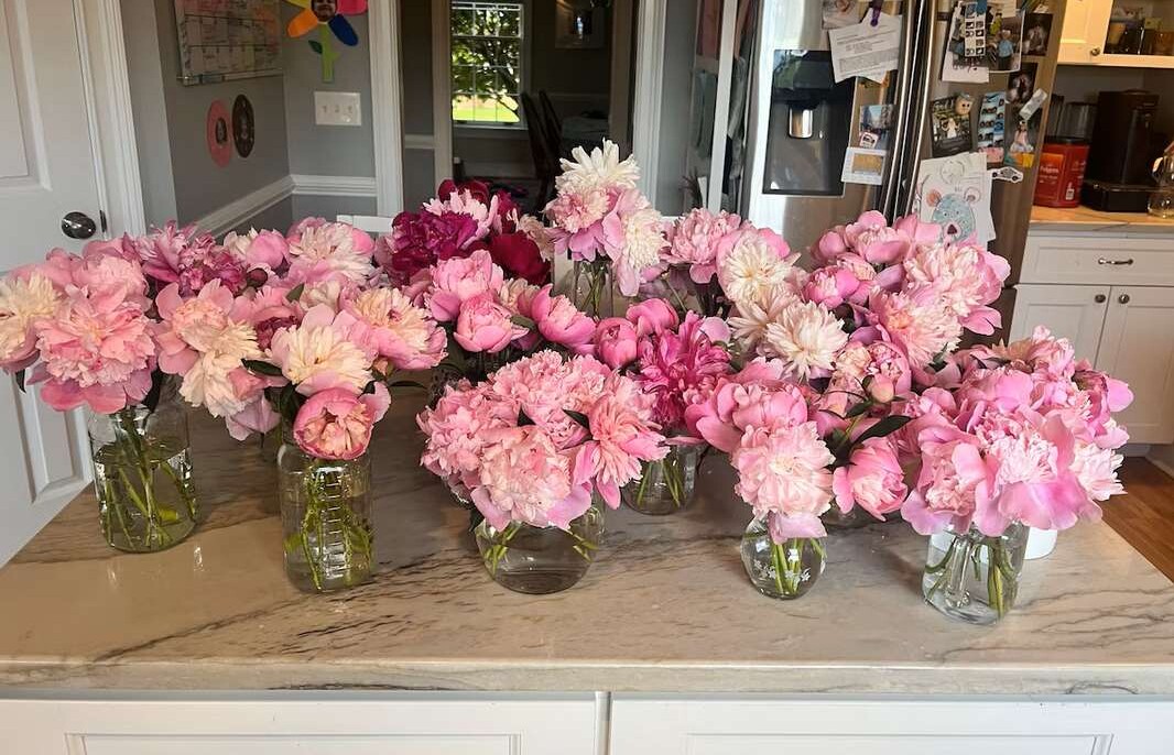“It’s a simple thing to pick out what’s wilted, add some of our own [flowers] if needed, and share the joy one more time,” said Ruth, whose own kitchen is usually spilling over with donated zinnias, daisies, and dahlias which they specialize in.