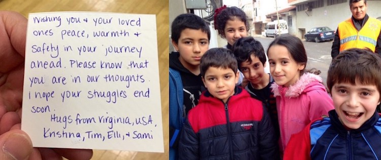 Some of the volunteers wrote notes and tucked them in the pockets, so refugee children would receive warm wishes along with their warm clothes.