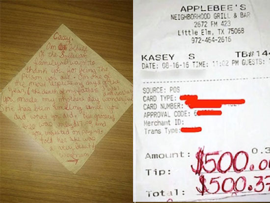The next evening, a customer bought nothing but a $0.37 water – but included on their receipt was a $500 tip.