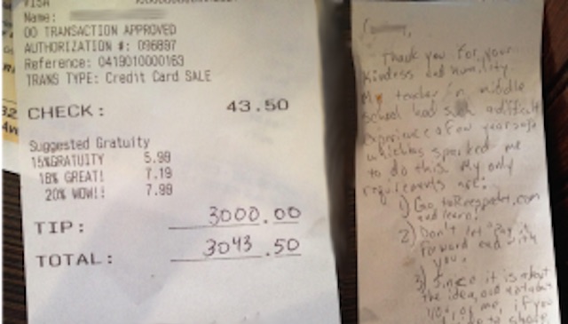A down-on-her-luck New York waitress was shocked last week when she was given a $3,000 tip on a $43.50 bill.