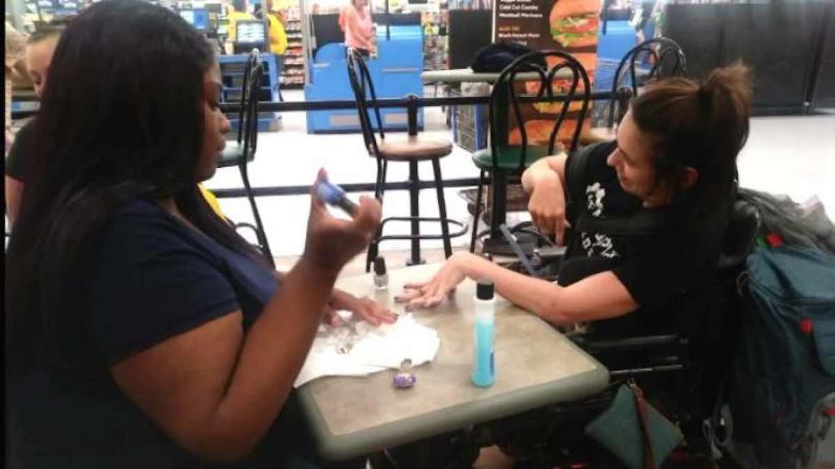 Harris works as a cashier at the Walmart in Burton, Michigan. As she was taking her lunch break last week, she watched as Angela Peters, a woman who is in a wheelchair for her cerebral palsy, was turned down at the indoor nail salon because her hands shake as a result of her condition.