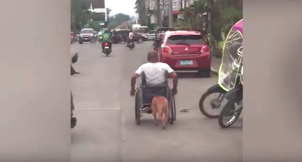 The 7-month-old pup was spotted on the streets of Davao in the Philippines pushing his disabled owner along in a wheelchair.
