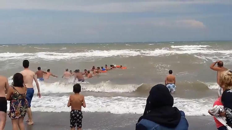 These lifeguards may not have been able to rescue three struggling swimmers from the vicious waves if it hadn’t been for the help of nearby civilians.