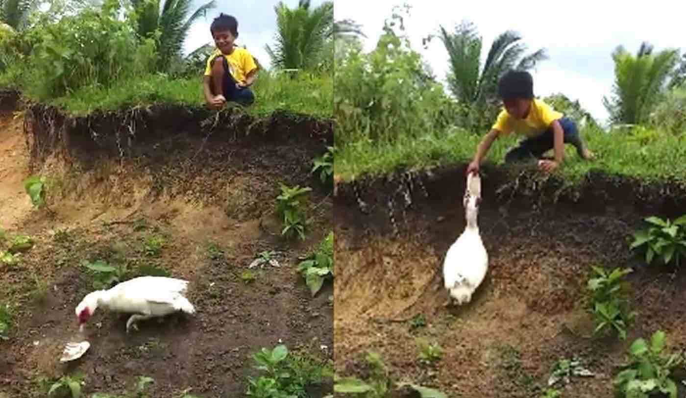 When a little boy accidentally dropped his sandal into a muddy ravine, it was returned by none other than a thoughtful duck.