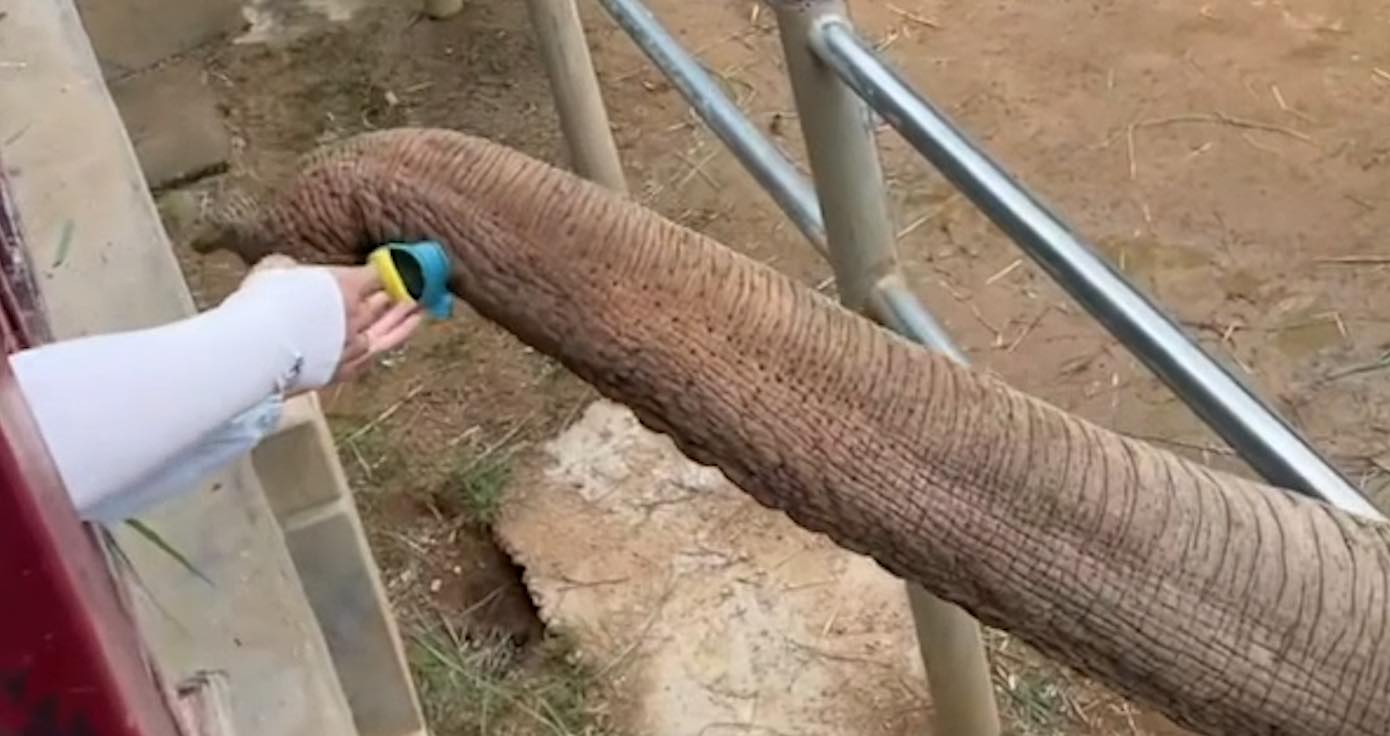 The 25-year-old pachyderm used its trunk to grab the sandal from the dirt and reach up to the child after the little shoe fell into the zoo enclosure in Weihai, China.