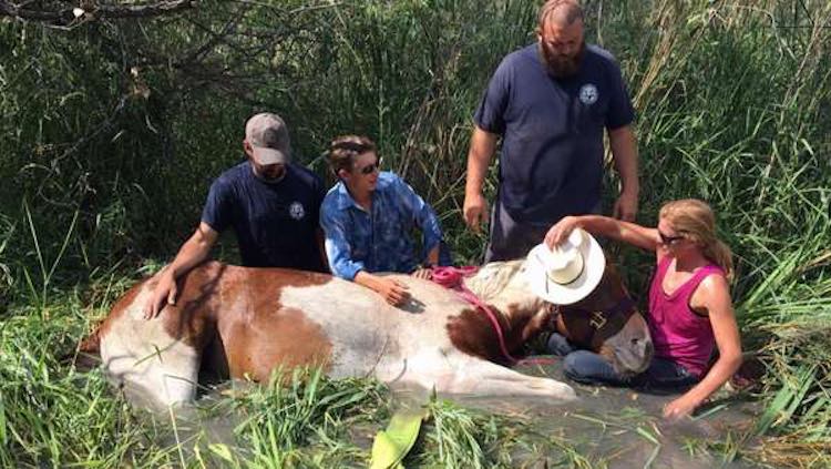 15 firefighters were dispatched to the middle of a swamp where a 13-year-old horse had fallen into muddy waters.