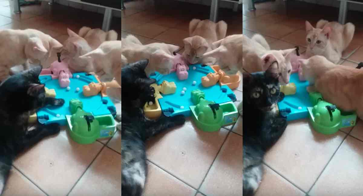 In a YouTube video that was published by Viral Hog, four cats who had been rescued from the Brazilian streets of Vila Piaui, Sao Paulo were caught playing a round of “Hungry, Hungry Hippos” together.