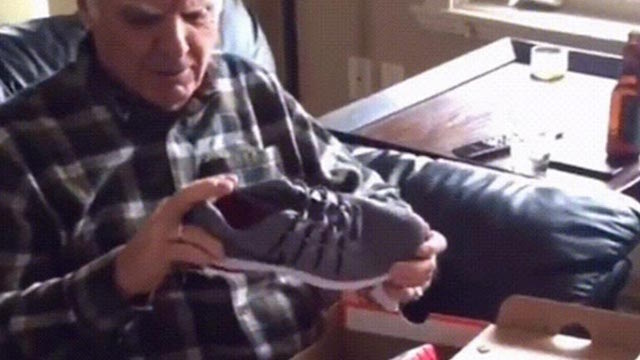 In honor of the senior’s birthday, his daughter tracked down the adult-sized kicks over the internet and filmed the big reveal.