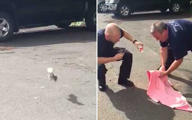 Finally, one of the responders managed to wrap the animal in a towel while a second gently plucked the cup off of its head.