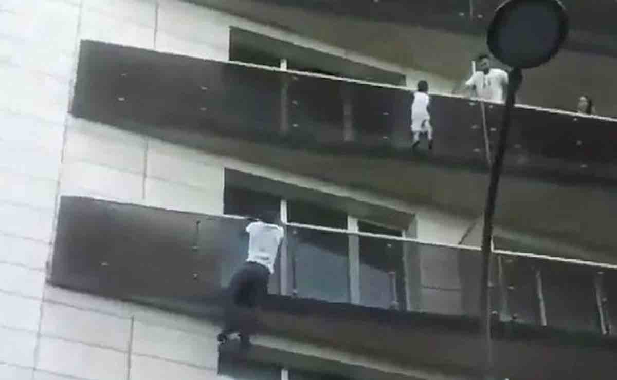 A boy was crying and clinging to the outside of the balcony balcony railing. Meanwhile, the next door neighbors were struggling to rescue the boy.