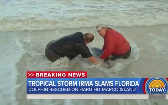 MSNBC reporter Kerry Sanders became a firsthand example of this spirit after he helped rescue two dolphins – one baby and one adult – from the shores of Marco Island in Florida.