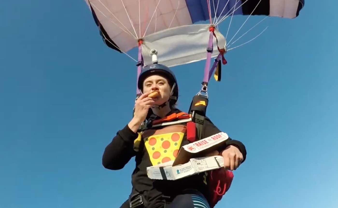 This is the incredible moment a hungry skydiver managed to have pizza delivered to her at more than 2,000 feet in the air.