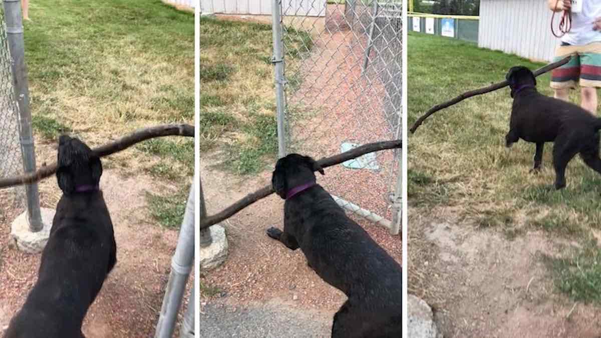 Absorbed in the task at hand, Lupe kept running into the gate with the stick sticking horizontally out of her mouth – nevertheless, she persisted.
