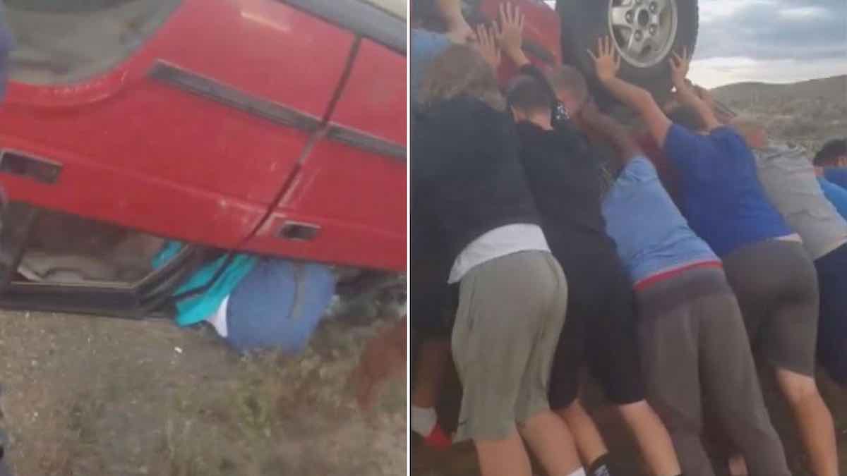 The coach immediately pulled over and the team members, all of whom were 13 years or younger, rushed to rescue the couple who was trapped inside the car.