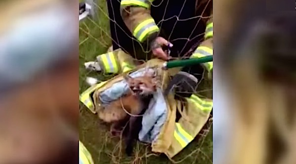 The kind emergency personnel then carried the fox toward the woods so it could scamper off to safety.