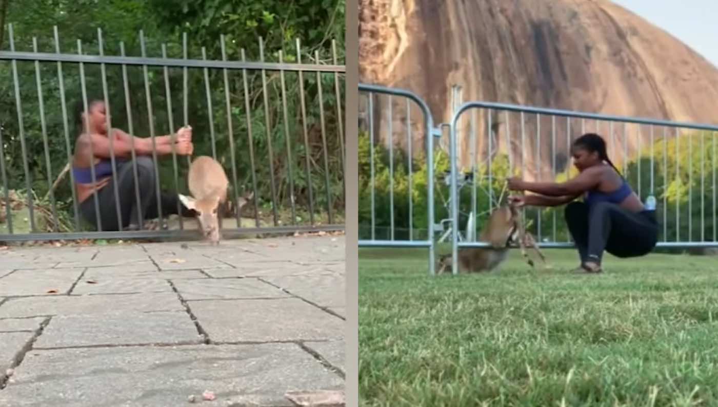 As the liberated doe rejoins the rest of the herd nearby, Dorsey jokingly yells after them: “Y’all need to show her how to jump!”