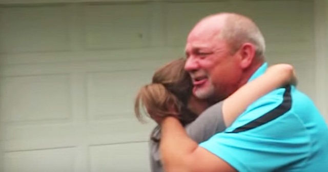 When the lucky stepdad walks outside, he doesn’t realize the car is his right away – but when he does, he can’t believe it.