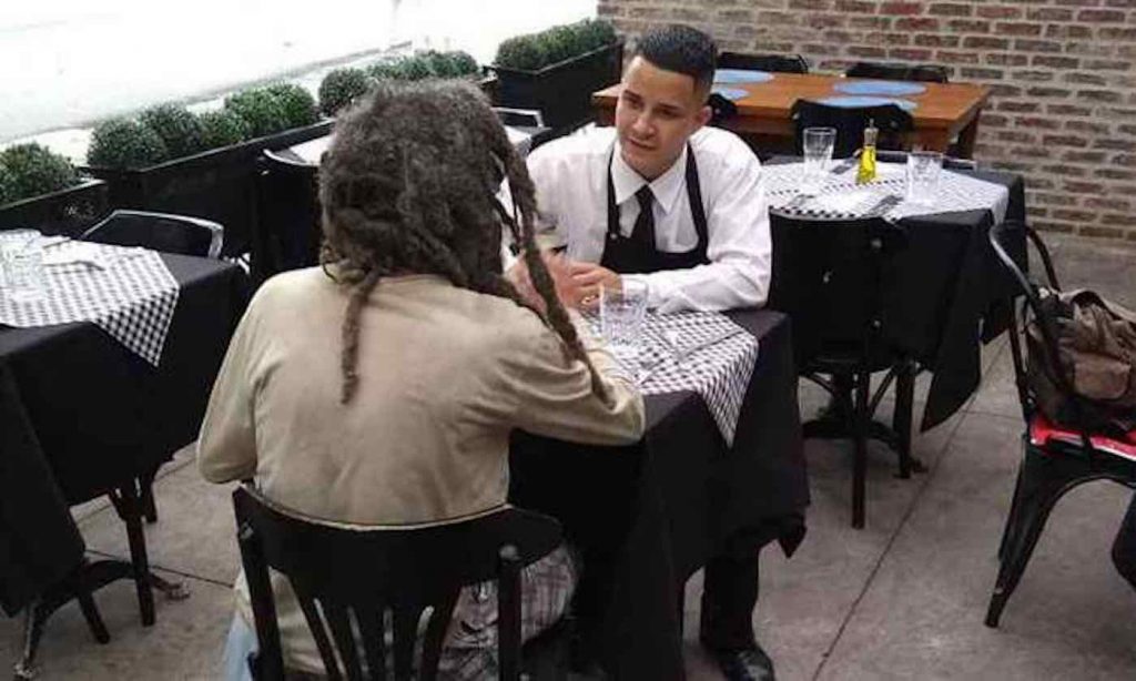 A customer having lunch with her friends took a picture of the man and the waiter and posted it to a private Instagram, saying: “We just watched a great example of compassion and synergy. The ease of this guy made me think about the many paths we choose in life trying to be happy … and many times, it’s in the simplest and most truthful and unexpected way that is is closer and more accessible than we realize.”