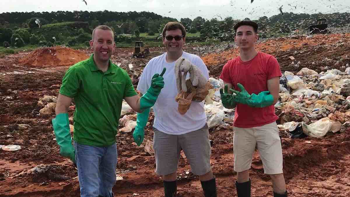 Not to be discouraged, Gayheart got three of his employees, Alex Chandonnett, Jordan De La Rosa, and Bobby Barnhart, to go with him to the landfill and sort through the trash in search of Bunny – and they actually managed to find him amidst the garbage.