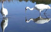 Whooping cranes, named for their loud and penetrating unison calls, live and breed in wetlands, where they feed on crabs, clams, frogs and aquatic plants. They are distinctive animals, standing 5 feet tall, with white bodies, black wing tips and red crowns on their heads.