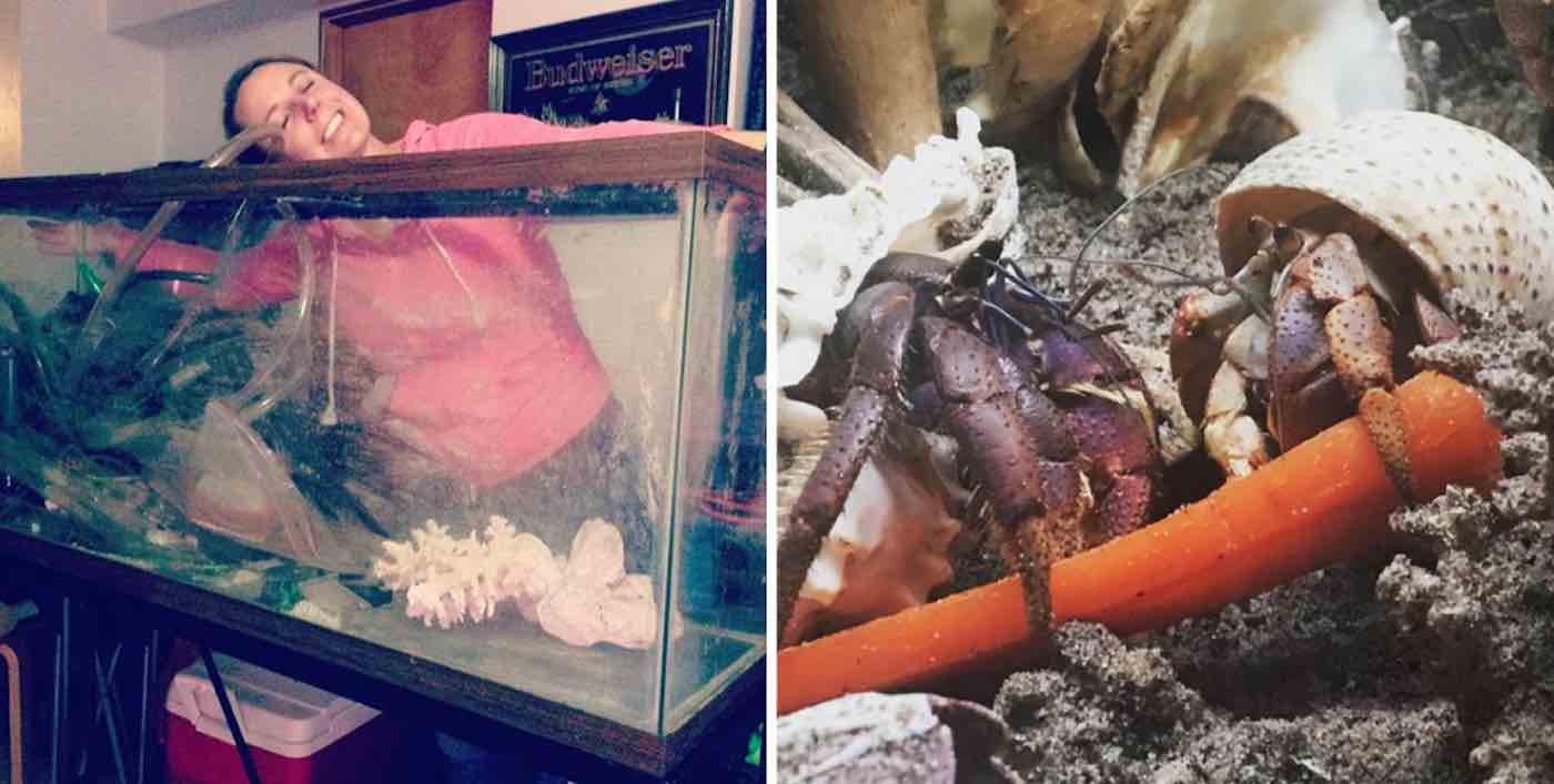 Since hermit crabs are native to the Caribbean, Porter is unable to reintroduce them to the wild. She has, however, turned a 55-gallon tank into a “crabitat” for her beloved clawed critters – and based on their daily treats of veggies and watermelon, it seems pretty safe to say that they are happy as clams.
