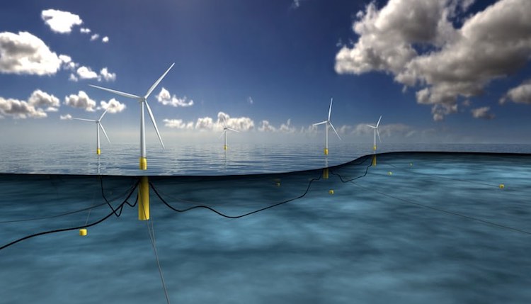 All the five turbines that will power the Peterhead Wind Farm will soar overhead at 575 feet tall (175m) atop a flotation base with a depth of 229 feet (70m). Located 15 miles offshore, the farm will power over 20,000 Scottish homes.